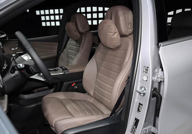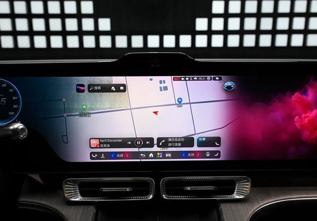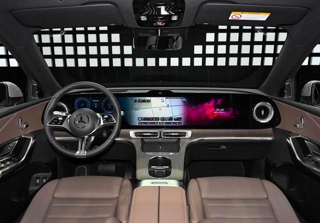 内饰部分,贯穿式超大屏超过了30英寸,有着出色的视觉效果,Hud进行辅助,科技感不输国内对手。方向盘则是相对传统的样式,左右两侧加入了圆形的空调出风口,集成的气氛灯带,T字形的中控台面,配有双杯架,手机无线充电面板,层次感丰富的门板装饰也依旧豪华感十足。还有三叉星的全景天幕气氛灯,增强了氛围的烘托。
