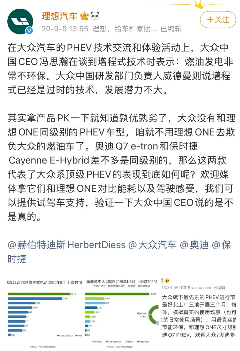 据澎湃新闻报道,理想汽车当时就驳斥了这一看法,李想在个人微博上进行了“回怼”,理想汽车也在微博上对大众汽车给出了回应。